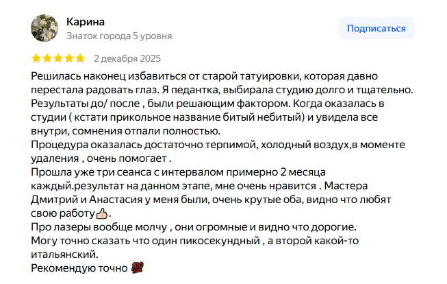 Честно: это не «приятно», но и не пытка. Средняя длительность работы лазера 2–3 минуты, мы используем крио‑установку до −40 °C, которая охлаждает кожу и снижает дискомфорт.Большинство клиентов после первого сеанса говорят: «Это было не так больно, как я себе накручивал(а)».